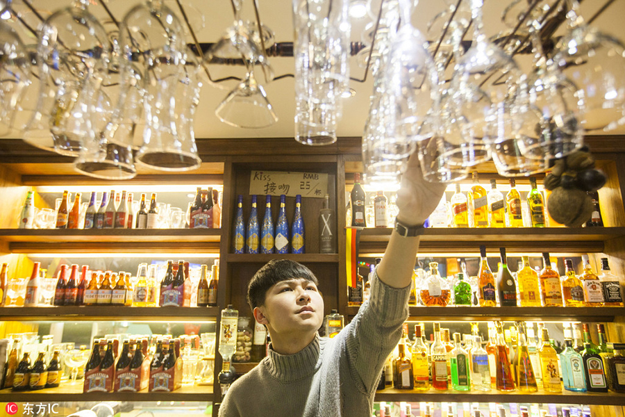 Chang Jie puts away wine glasses at a pub in Changchun, Jilin province, Dec 27, 2016. Chang always helps others when he finishes his duties. [Photo/IC] |