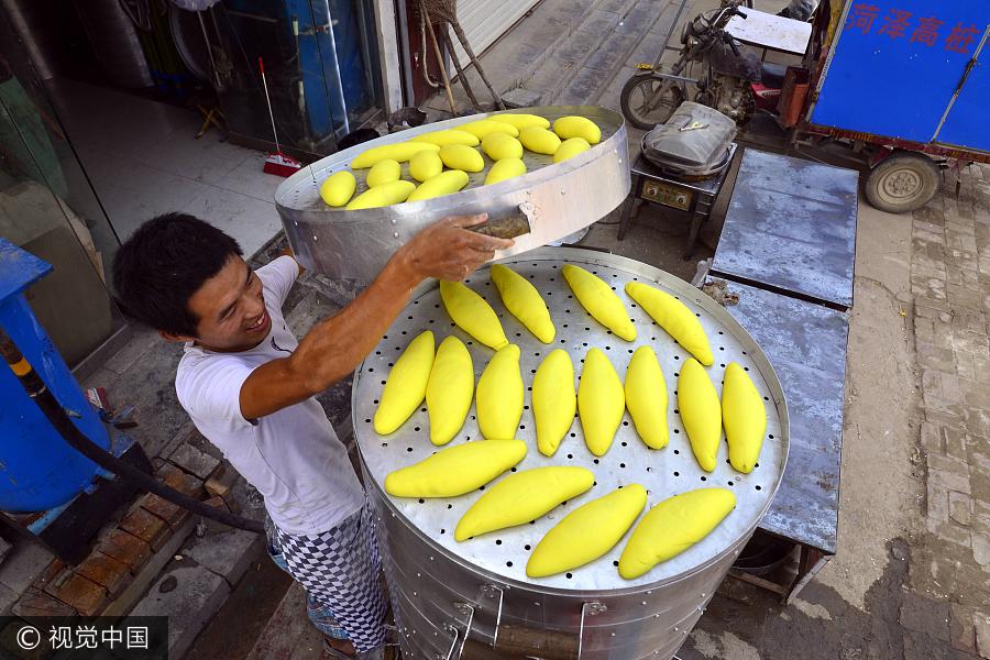 Wang Wei, who makes popular steamed bread, prepares to steam corn fodder paste in Liaocheng, East China's Shandong province. [Photo/VCG]