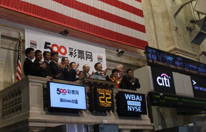 China's online sports lottery service provider 500.com starts trading at the New York Stock Exchange on Friday in New York.
