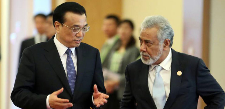 Chinese Premier Li Keqiang meets with Timor Leste's Prime Minister Jose Alexandre Xanana Gusmao, in Sanya, Hainan province, April 9, 2014.
