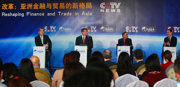 Honored guests communicate at a TV Debate named "Reshaping Finance & Trade in Asia" during the Boao Forum for Asia (BFA) Annual Conference 2014 in Boao, South China's Hainan province. The forum will be held from April 8 to 11.