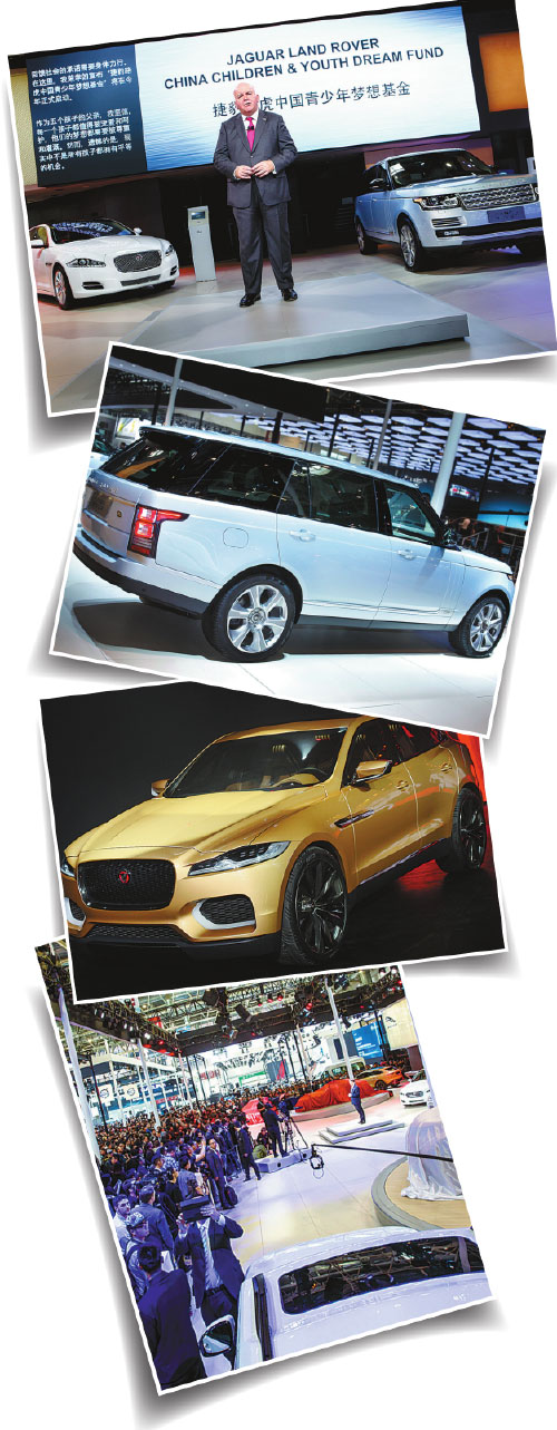 ![]() From top: The company plans to establish the Jaguar Land Rover China Children & Youth Dream Fund this year. A Range Rover Diesel Hybrid LWB model makes its global debut at the Beijing auto show. Jaguar C-X17. New models of Jaguar Land Rover attract numerous visitors at the show. Photos Provided to China Daily