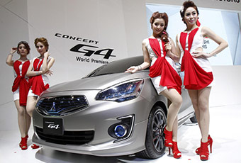 A model poses beside a Mitsubishi Mirage during a media presentation of the 34th Bangkok International Motor Show in Bangkok March 26, 2013.