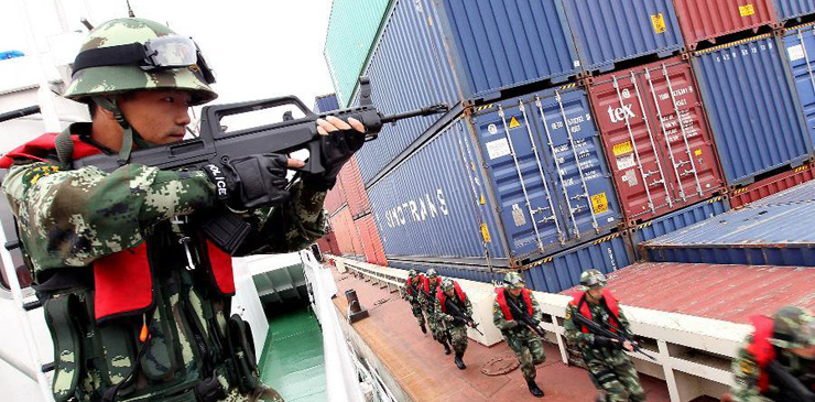 The local frontier policemen of the coast guard mission check a "suspected ship" during a security exercise at the sea area near Shanghai Free Trade Zone.