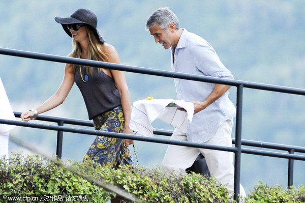 George Clooney with Stacy Keibler and a couple of friends are seen at sunset on Lake Como on August 9, 2012.[Photo/CFP] |