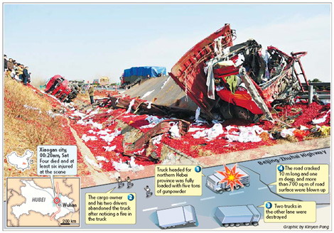 ![]() A truck carrying chili peppers lies toppled by the highway explosion in Hubei province on Dec. 5, 2009. [Xinhua] |