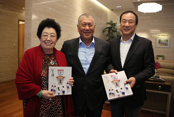 Ho Hau-wah (center), vice-chairman of the National Committee of the Chinese People's Political Consultative Conference, meets with Chan Laiwa (left), deputy director of Committee of Hong Kong, Macao and Taiwan Compatriots and Overseas Chinese of the CPPCC and founder of the China Red Sandalwood Museum, and Zhu Ling, CPPCC member and publisher and editor-in-chief of China Daily, in Macao on Tuesday. In hands of Chan and Zhu is a photo album —One Hundred Photographers Focus on Macao— which will be launched on Wednesday to celebrate the 15th anniversary of the return of Macao to China. The book presents a full picture of Macao. Geng Feifei / China Daily |