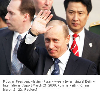Russian President Vladimir Putin waves after arriving at Beijing International Airport March 21, 2006. Russia and China aim to more than double bilateral trade by 2010, officials from both countries said, during a trip to China by President Vladimir Putin that will focus on deepening energy cooperation. Putin is visiting China March 21-22. [Reuters]