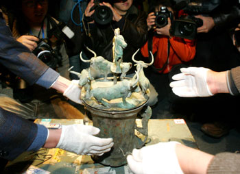 Art workers take a culture relic featuring four bulls of the Western Han