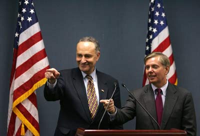 Lindsey Graham ask a question at a news conference in Beijing March 23, 2006.