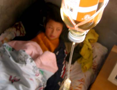 A Chinese student receives treatment at a hospital in Lingbi County, East China's Anhui Province, March 23, 2006. More than 30 students falls ill after measles vaccination at a primary school in the county, according to the website of the Xinhua News Agency. [Newsphoto]