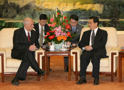 Chinese President Hu Jintao (R1) meets Brazilian Vice President Jose Alencar (L1) at the Great Hall of the People in Beijing, March 24, 2006. [Xinhua]