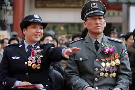 A Chinese policewoman and a security guard attend an award ceremony during a ceremony to promote eight honours