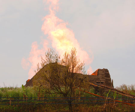 A fire can be seen after a gas leak in Gaoqiao, a town in Southwest China's Chongqing Municipality March 25, 2006. [Xinhua]