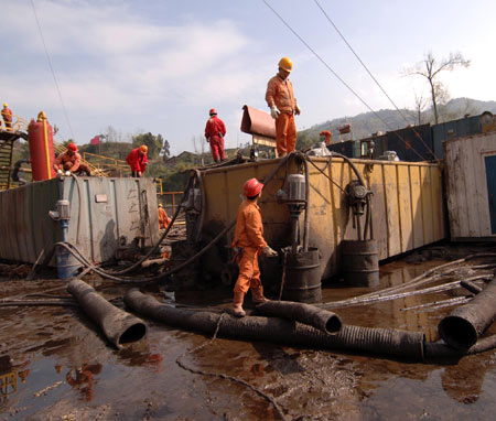 Workers prepare to stop a gas leak at a gas well in Gaoqiao, a town in Southwest China's Chongqing Municipality March 26, 2006. [Xinhua]
