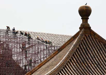 Workers erect scaffolding at the Hall of Supreme Harmony in the