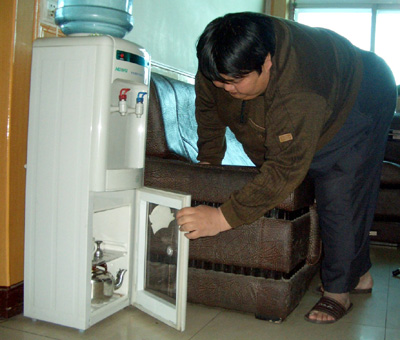 (441lbs), tries to get a cup from a water purification machine in Fugu