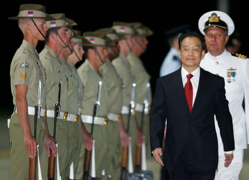 Chinese Premier Wen Jiabao (C) inspects an honour guard during an official welcoming ceremony in Canberra April 2, 2006. [Reuters]