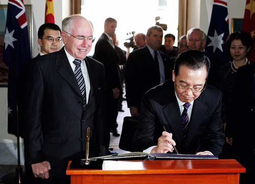 (L) watches as Chinese Premier Wen Jiabao signs the visitors' book at Parliament