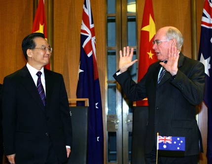 Premier Wen Jiabao (L) watches Australian Prime Minister