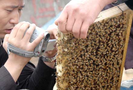 Bee venom treatment in Xi'an (newsphoto) Updated: 2006-04-05 15:57  A man videotapes a hive of bees at a clinic in the
