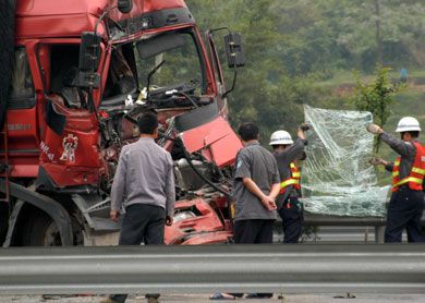 Rear-end collision happened in S. China Updated: 2006-04-21 15:36  Local traffic police and expressway staff workers clean up after a