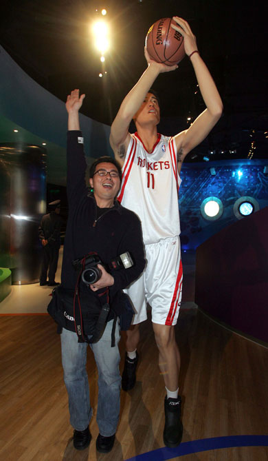 A visitor poses next to the waxwork of NBA Center Yaoming on April