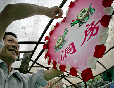 700-year-old weds 80-year-old (newsphoto) Updated: 2006-04-25 10:32  A staff worker prepares the wedding room for the newlyweds,
