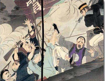 century wood-print image of Japanese soldiers beheading Chinese prisoners
