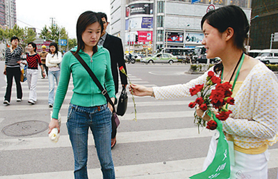 carnation to a young woman as a token of appreciation for using a pedestrian