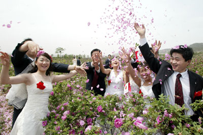 Romantic wedding in a rose garden (Xinhua) Updated: 2006-05-11 10:03  Twenty pairs of newly-wed couples hold a group ceremony in a rose
