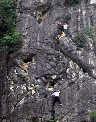 A policeman climbs on a cliff in a bid to rescue two trapped