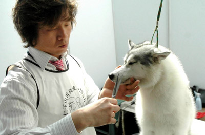A pet beautician gives a dog a trim in Tianjin Municipality May 16, 2006. As the standard of living rises, the pet business is gradually expanding across the nation. [Xinhua]