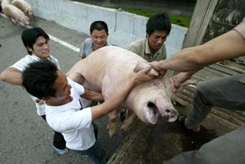Local residents try to load a captured pig