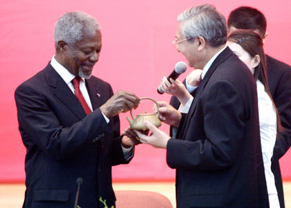 Annan speaks at Peking University (newsphoto/Xinhua) Updated: 2006-05-23 08:03  UN Secretary-General Kofi Annan (L) receives a ceramic teapot as a