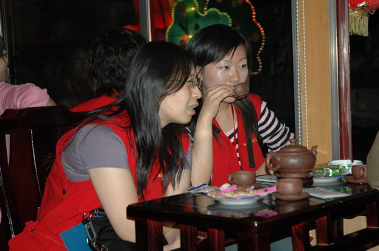 Online reporters enjoy tea during a night trip along the Qinhuai River in Nanjing, capital of E. China's Jiangsu Province. [people.com.cn]