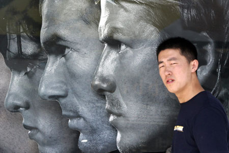 A shopper walks past an advertisement of World Cup soccer players in Beijing
