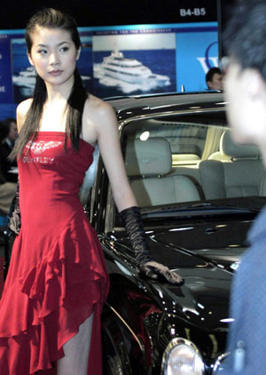 A model poses besides a car model at an auto show in Shanghai in September 2005. [Xinhua]