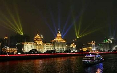 A light show brightens the historic Bund skyline, across the