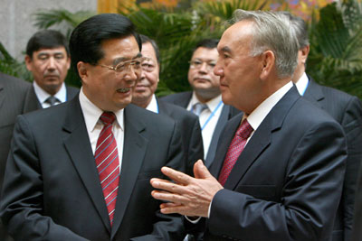 Chinese President Hu Jintao (L) chats with Kazakh President Nursultan Nazarbayev during the Shanghai Cooperation Organization (SCO) Summit in Shanghai June 14, 2006. [Reuters]