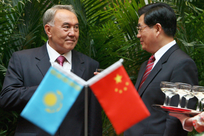 Chinese President Hu Jintao (R) chats with Kazakh President Nursultan Nazarbayev during the Shanghai Cooperation Organization (SCO) Summit in Shanghai June 14, 2006. [Reuters]