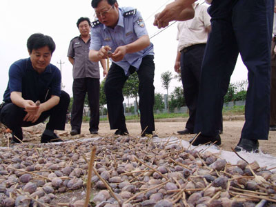 Police officers examine opium before destroying them in Xucheng city, central China's Henan province. [Newsphoto]