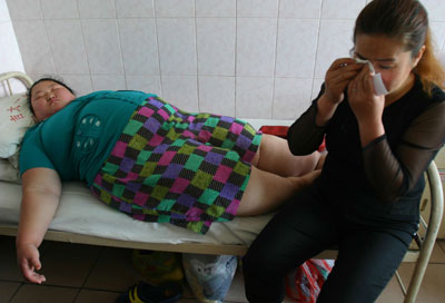 Jin Yun (L) who is 151 kg (333 pounds) takes a nap as her mother
