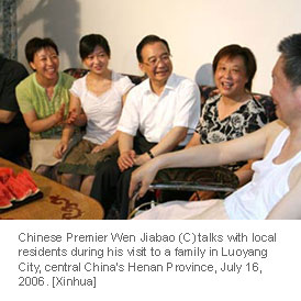 Chinese Premier Wen Jiabao (C) talks with local residents during his visit to a family in Luoyang City, central China's Henan Province, July 16, 2006. [Xinhua]