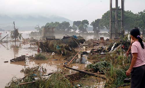 Local residents look at the debris left by rainstorms from typhoon Bilis in Shaoguan, South China' Guangdong Province on July 17, 2006. [Xinhua]