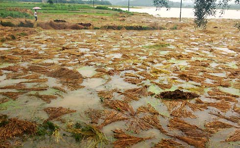 A farmer checks the flooded field after rainstorms unleashed by typhoon Bilis in Guiping, Southwest China's Guangxi Autonomous Region on July 17, 2006. [Xinhua]
