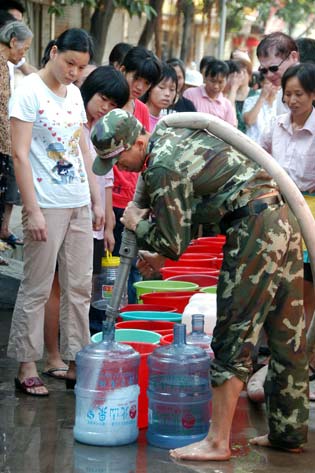 A soldier helps distribute clean water as local residents wait in line at a distribution point in Shaoguan, South China's Guangdong Province, July 19, 2006. [Newsphoto]
