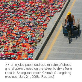Hundreds of pairs of shoes and slippers are placed on the street to dry after a flood in Shaoguan, south China's Guangdong province, July 21, 2006. [Reuters]