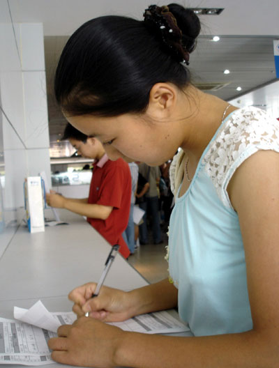 A girl fills in an application form at a job fair in Suzhou, east China's Jiangsu province July 26, 2006. The fair offers more than 1, 000 vacancies for potential employees. [Newsphoto]