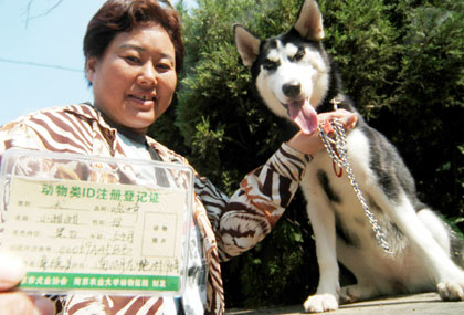 Dog with a chip (Xinhua) Updated: 2006-08-22 12:41  A resident in Nanjing, east China's Jiangsu Province, shows